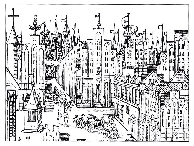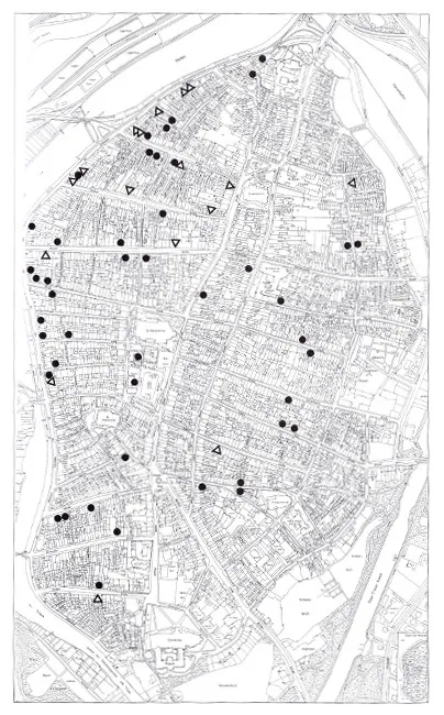 Die Karte zeigt: Hauseigentum der Älterleute der St. Nikolaus-Bruderschaft (schwarzer Punkt) und der Älterleute und Schaffer der St. Annen-Bruderschaft (Dreieck).
